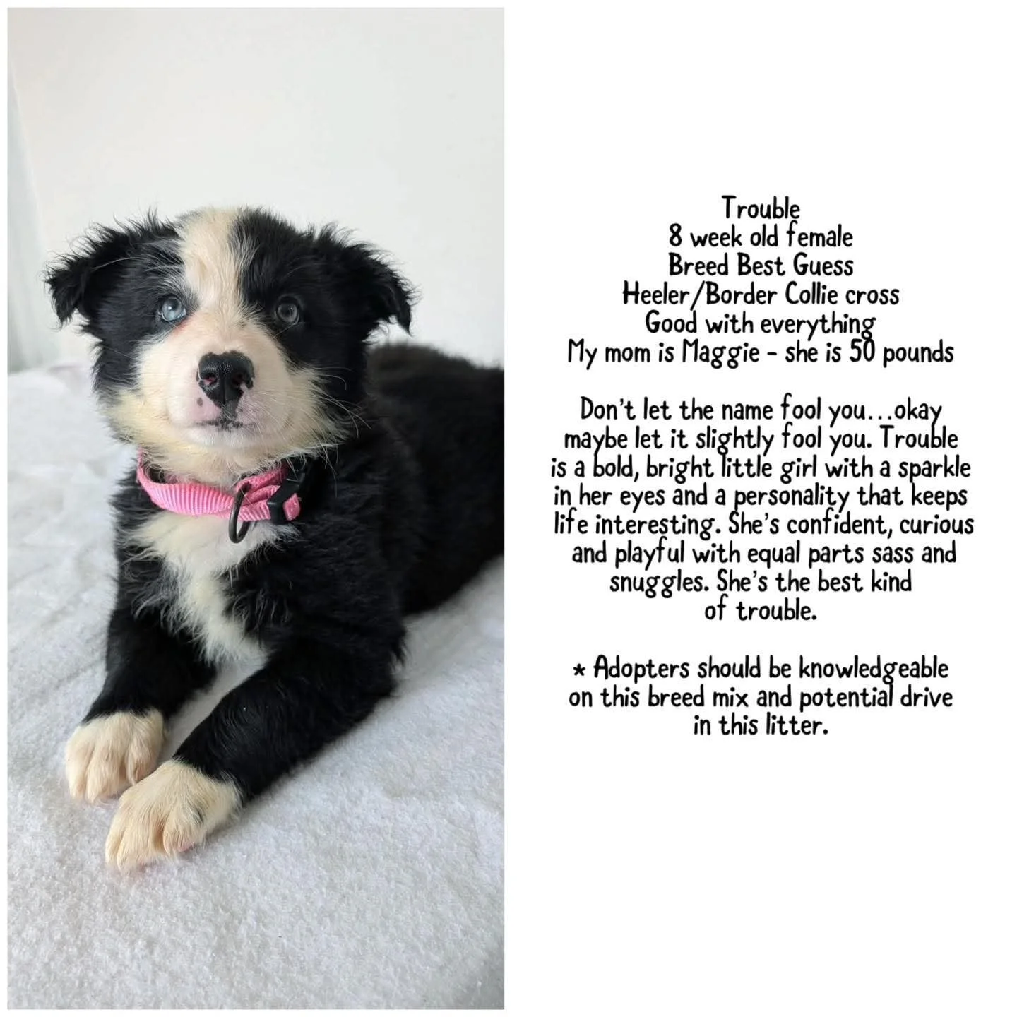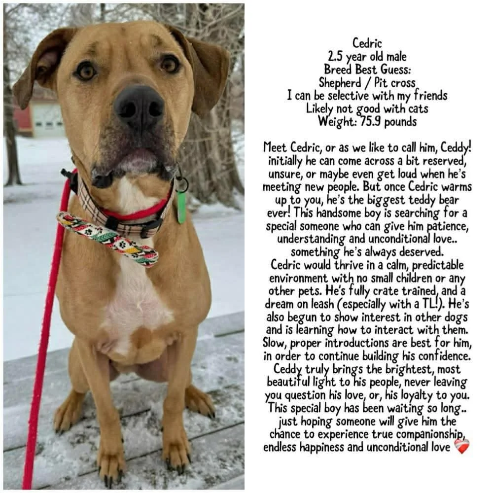 please contact us for more information through Facebook as that is our fastest response - if you do not have Facebook please click here for an alternative for inquires on adopting a DOG.
